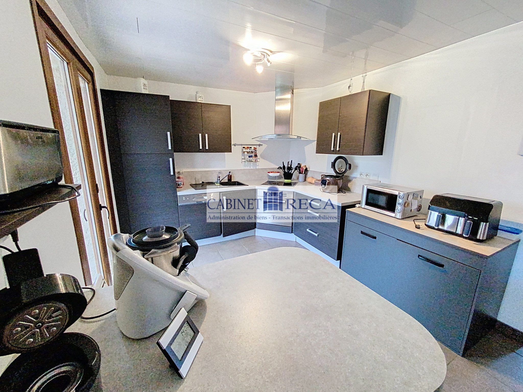 Hall d'entrée, spacieuses pièces à vivre salon-salle à manger, cuisine ouverte aménégée et équipée, 3 chambres, salle d'eau récente, WC, Laverie.